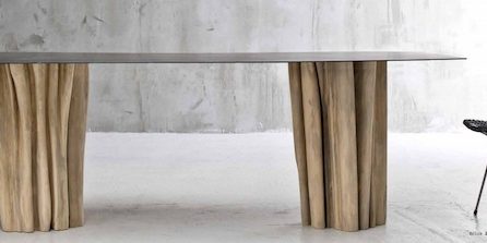 Un tavolo con la base ricavata da una sezione di tronco di wrightia scortecciato e intagliato a mano, il piano, sottilissimo, in lamiera di ferro cerata.