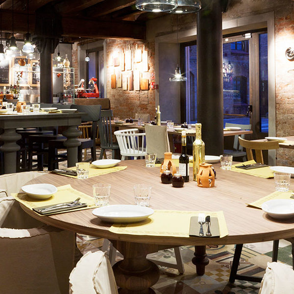 All’interno il clima è volutamente ispirato all’atmosfera di un enorme cantina: muri di pietra, damigiane di legno lucide su cui poggiano bottiglie dei migliori vini. I colori e l’atmosfera sono caldi, naturali, i tavoli e le sedie non si discostano da questa linea.